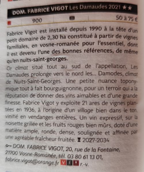 Ce climat situé tout au sud de l’appellation, Les Damaudes prolonge vers le nord les ... Damodes, climat de Nuits-Saint-Georges. Une petite nuance toponymique tout à fait bourguignonne, pour un terroir qui a la réputation de donner des vins aimables et d’une grande finesse. Fabrice Vigot y exploite 21 ares de vignes plantées en 1936, à l’origine d’un village bien dans le ton, vinifié en vendanges entières. Un vin expressif, sur la noisette grillée et les fruits rouges bien mûrs, doté d’une matière ample, ronde, dense, soulignée et affinée par une agréable fraîcheur fruitée.