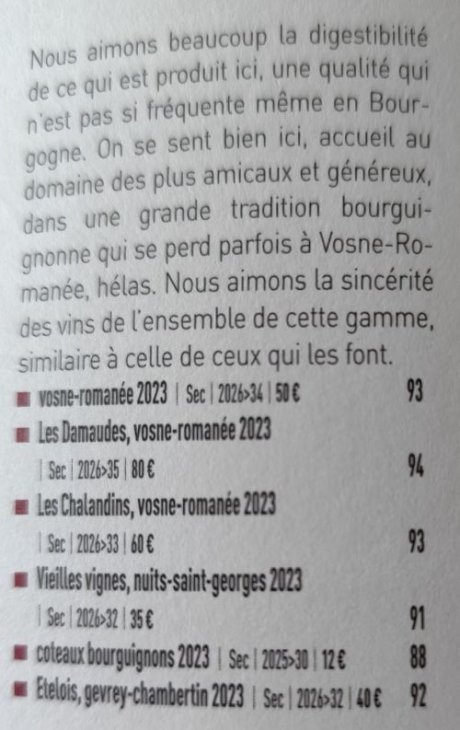 Nous aimons beaucoup la digestibilité de ce qui est produit ici, une qualité qui n’est pas si fréquente même en Bourgogne. On se sent bien ici, accueil au domaine des plus amicaux et généreux, dans une grande tradition bourguignonne qui se perd parfois à Vosne-Romanée, hélas. Nous aimons la sincérité des vins de l’ensemble de cette gamme, similaire à celle de ceux qui les font.